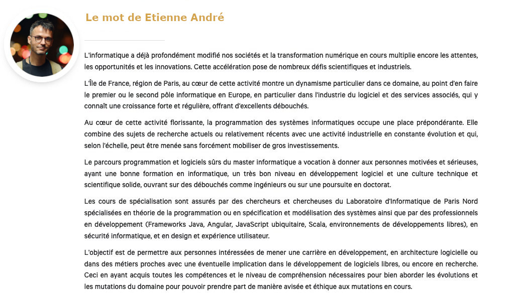 La première année du master permet une poursuite des études dans l'une des orientations proposées, mais elle favorise aussi les échanges (accueil en 2ème année d'étudiants d'autres masters) et la mobilité de nos étudiants (départ vers d'autres masters). En seconde année, une partie du troisième semestre est spécifique à chacun des parcours-types proposés, avec cependant une mutualisation des UE transversales et les cours optionnels. Le quatrième semestre est dévolu principalement au stage de fin d'étude, avec deux orientations possibles pour chaque spécialité, l'une conduisant aux métiers d'ingénieur et l'autre aux métiers de la recherche. En effet, par le choix de ses options et la finalité de son stage de fin d'études, l'étudiant pourra choisir une orientation professionnelle ou la voie de la recherche. Les diplômés de ce master auront une très bonne connaissance des fondements théoriques, algorithmiques et méthodologiques, de fortes capacités pour mener un travail de recherche fondamentale ou appliquée sur un problème bien ciblé dans des domaines de la spécialité choisie. Les cours de spécialisation sont assurés, d'une part par des chercheurs et chercheuses du LIPN spécialisés dans les thématiques abordées, et d'autre part, par des professionnels experts du domaine.